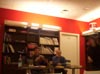 Questa foto è stata scattata sabato 10 marzo, intorno alle 19, nella libreria ristorante Café au Livre di Padova (ph. Melassa). Pubblico presente: circa tre persone. Io sono d'umor nero. Vorrei sfasciare tutto. Morale: diffidare dei librai dilettanti allo sbaraglio. Lasciarli cuocere nel loro brodo. Che vendano Moccia. Che vadano a farsi fottere. Per fortuna Marco Franzoso era lì a farmi coraggio.